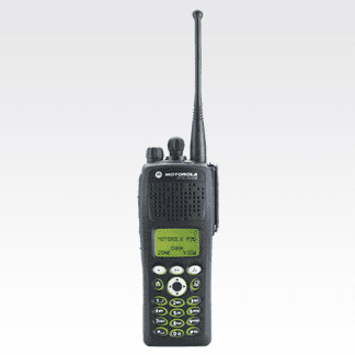 Radio portátil Motorola P25 digital con batería, antena y cargador.